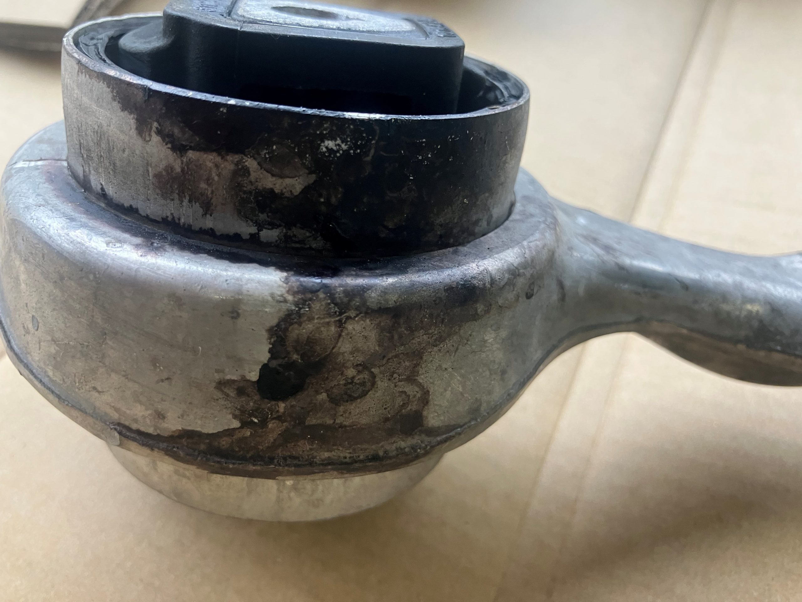 調べてみると、ロアアームからのオイル漏れとゴムのひび割れを発見!!